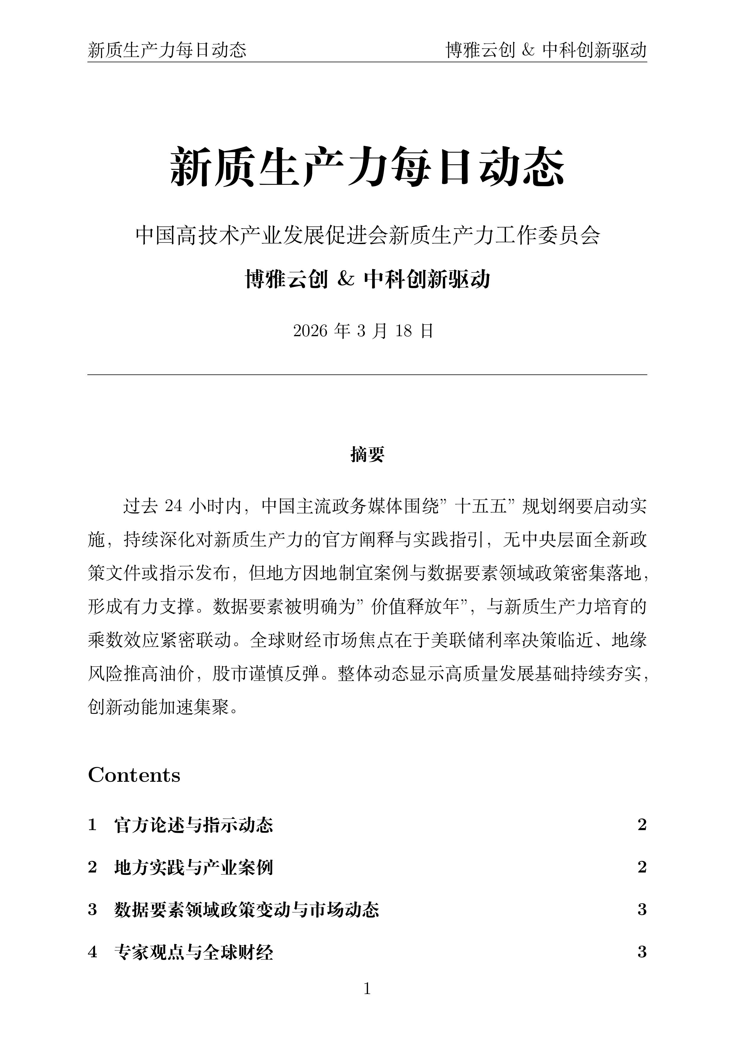 新华社3月17日政论:发表《推进中国式现代化行稳致远——写在"十五五"规划纲要启动实施之际》,强调"发展新质生产力是建设现代化产业体系的必然要求,是推动高质量发展的强劲引擎"。文章指出,新质生产力作为引领未来发展的新动能,其培育需因地制宜,根据本地资源禀赋、产业基础、科研条件,有选择地推动新产业、新模式、新动能发展,走出各具特色的路径。