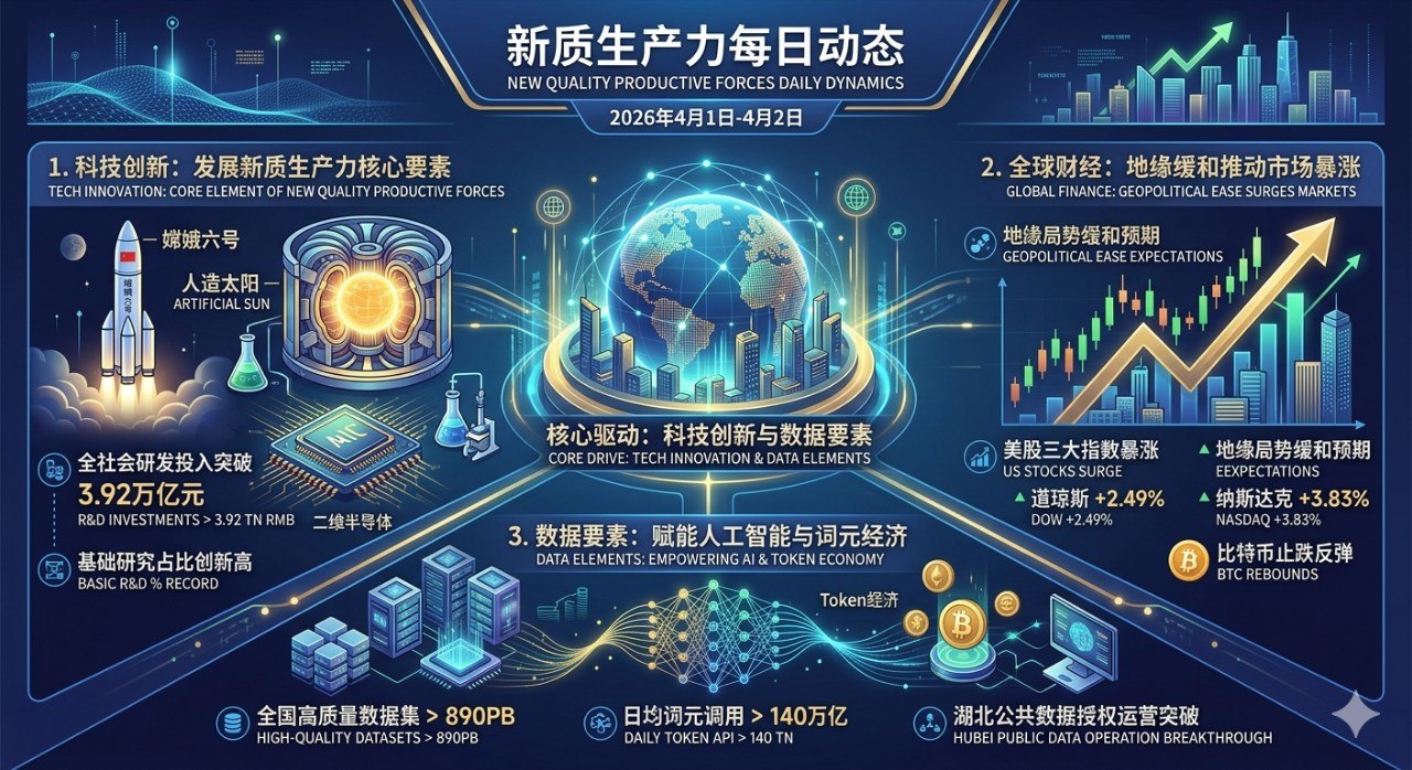 动态概述:2026年4月1日,国资委及新华社联合发布《科技创新实现新突破——学习贯彻习近平总书记全国两会期间关于发展新质生产力重要论述系列述评之一》。文章针对2026年("十五五"开局之年)的战略方位,明确指出科技创新是发展新质生产力的核心要素。