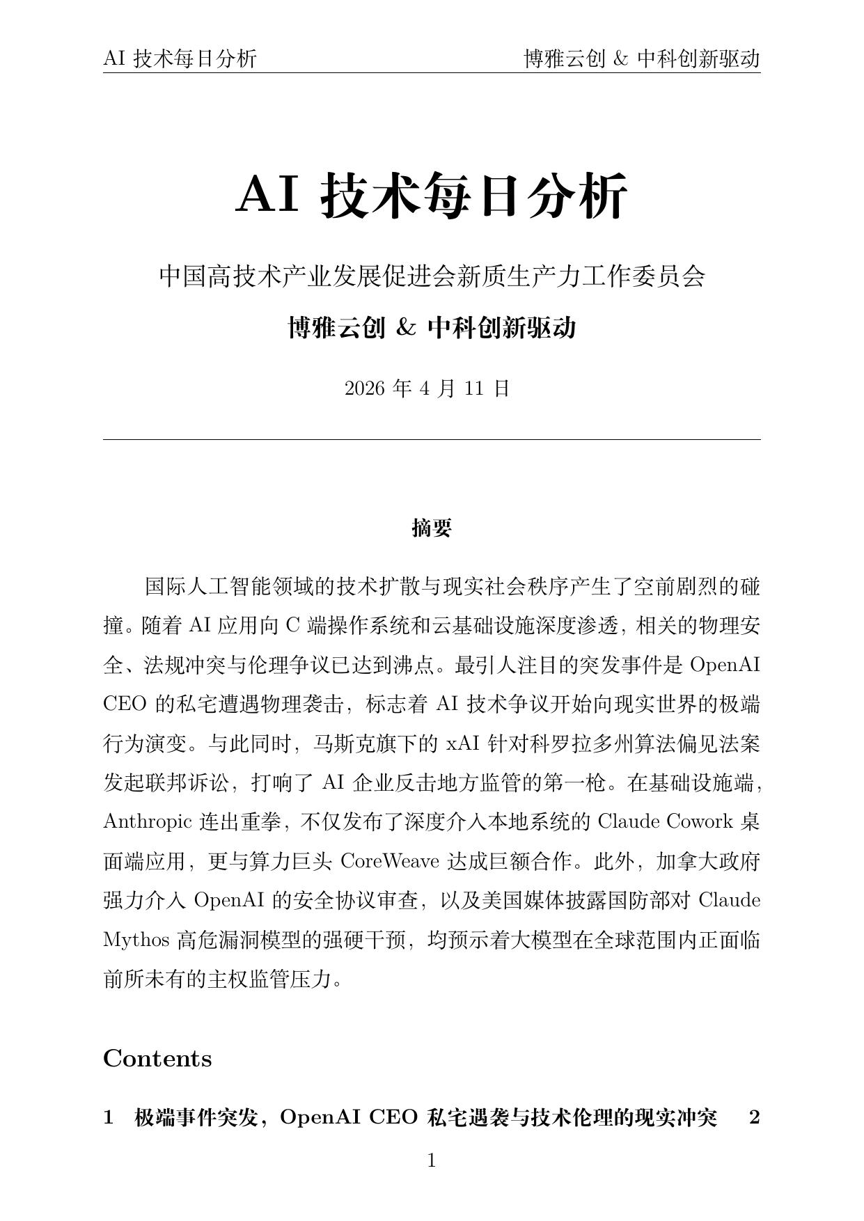 过去24小时内,AI行业最核心的震荡并非来自底层算法的更新,而是现实世界物理安全的红线被突破。根据法新社(AFP)及加州警方确认,OpenAI CEO山姆·奥特曼(Sam Altman)位于旧金山的豪华私宅遭到燃烧瓶袭击,目前一名嫌疑人已被警方逮捕。