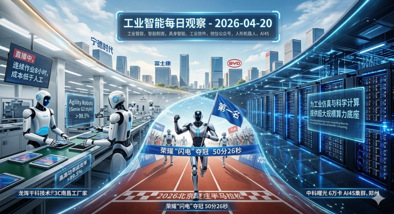 摘要:具身智能产业迎来里程碑式的一周。智元机器人在龙旗科技南昌工厂完成8小时真实产线直播,成功率超99.5%,成本已低于人工;北京亦庄人形机器人半马开赛,荣耀"闪电"50分26秒夺冠。具身智能企业集体冲向百亿估值,银河通用、千寻智能、智元等在宁德时代等头部制造企业实现7×24小时全自主作业。中科曙光6万卡AI4S集群在郑州投用,为工业仿真与科学计算提供超大规模算力底座。