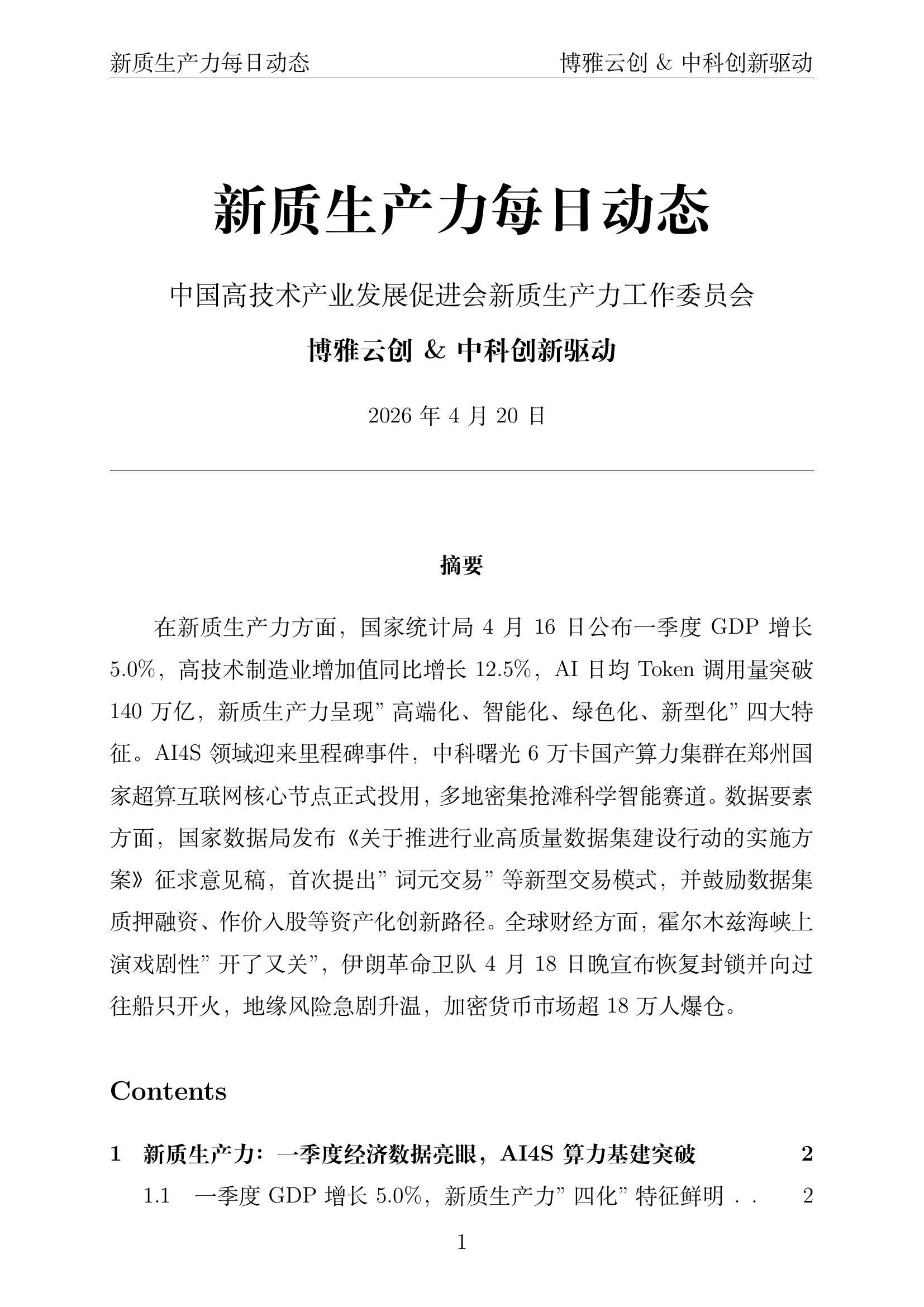 摘要:国家统计局公布一季度GDP增长5.0%,高技术制造业增加值同比增长12.5%,AI日均Token调用量突破140万亿,新质生产力"四化"特征鲜明。AI4S领域,中科曙光6万卡国产算力集群在郑州投用,多地抢滩科学智能赛道。数据要素方面,国家数据局发布《行业高质量数据集建设行动实施方案》征求意见稿,首提"词元交易"新模式。全球财经方面,霍尔木兹海峡戏剧性"开了又关",伊朗革命卫队恢复封锁并向过往船只开火,加密货币市场超18万人爆仓。