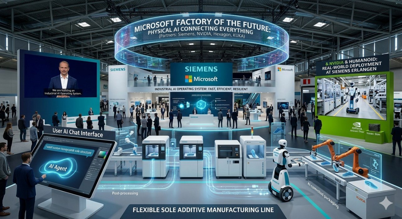 微软在汉诺威工博会上推出了"未来工厂"(Factory of the Future)演示,展示Physical AI如何将设计、仿真和执行连接为一个统一的自适应制造系统。据微软云博客报道,这一演示联合了Hexagon、西门子、英伟达、KUKA等合作伙伴,展示了从产品设计到产线仿真再到实际生产执行的全链路AI驱动流程。微软的核心理念是"工业智能解锁"(Industrial Intelligence Unlocked)——不是用AI替代工厂中的某个环节,而是用AI将所有环节连接成一个能够自我感知、自我调整的整体系统。