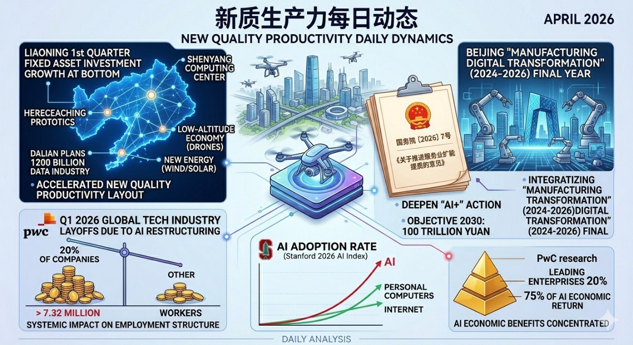 摘要:国务院4月21日印发《关于推进服务业扩能提质的意见》,明确深入实施"人工智能+"行动,支持采购大模型、智能体服务,目标2030年服务业总规模迈上100万亿元。辽宁新质生产力布局加速,沈阳算力中心建设、大连1200亿数据产业规划。PwC研究显示75%的AI经济回报被20%企业获取。2026年Q1全球科技裁员超7.32万人,AI对就业结构冲击加速。北京市制造业数字化转型方案进入收官之年。