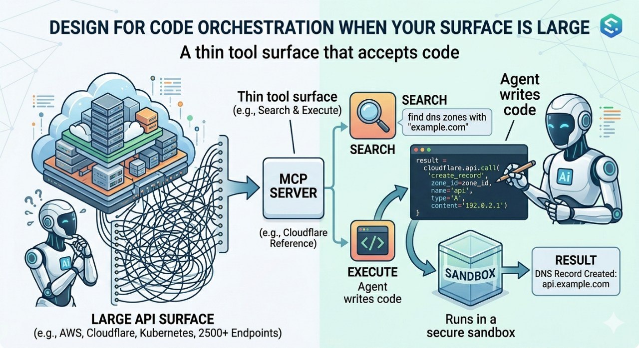 意思是,不要试图为几千个 API 都设计成独立工具,而是只暴露一个很薄的工具层,比如: