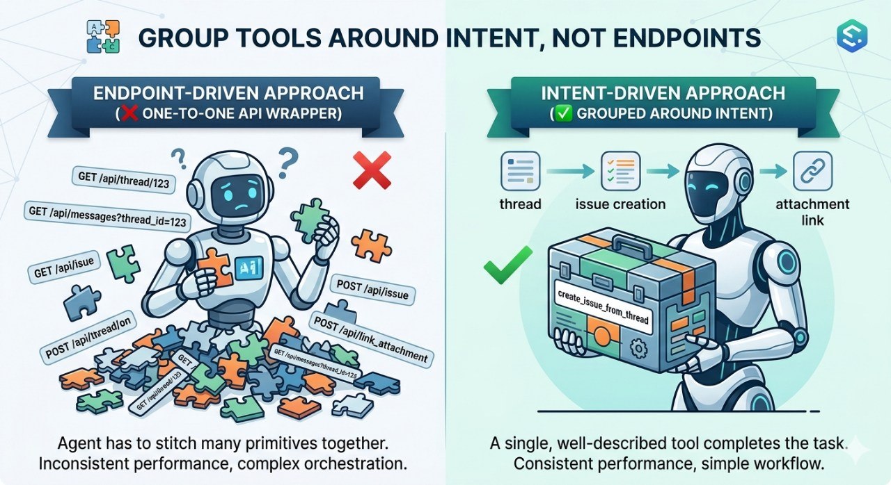 不要把 API 一比一照搬成 MCP 工具,而要按“用户意图”组织工具。