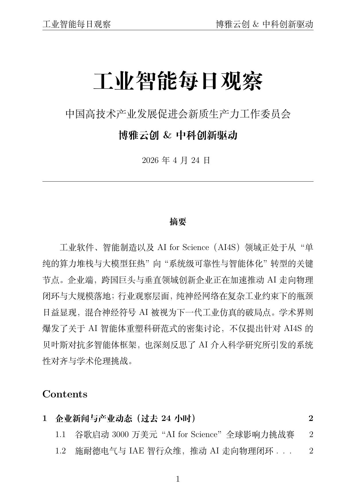 摘要:工业软件、智能制造以及AI for Science领域正处于从“单纯的算力堆栈与大模型狂热”向“系统级可靠性与智能体化”转型的关键节点。谷歌、施耐德电气、IAE智行众维等企业加速推动AI走向物理闭环与大规模落地,混合神经符号AI被视为下一代工业仿真的关键路径,学术界则密集讨论AI智能体如何重塑科研范式及其带来的系统性对齐挑战。