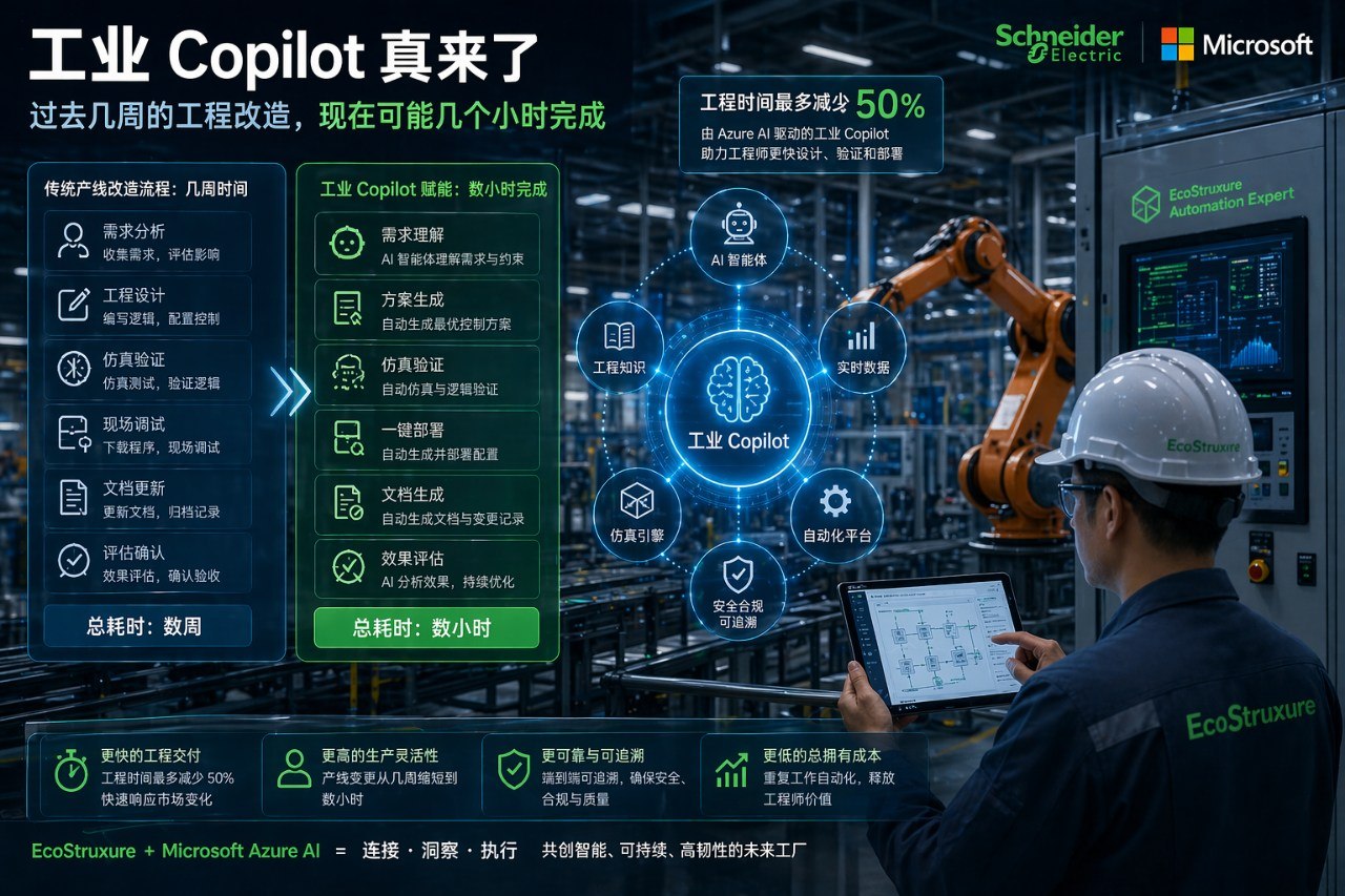 按照施耐德电气官方发布的信息,这次双方合作的核心,是把施耐德的 EcoStruxure Automation Expert 与 Microsoft Azure 云和 AI 服务结合起来,形成面向制造业的工业 Copilot 和智能体制造能力。官方给出的说法很直接:由 Azure AI 驱动的工业 Copilot,可以把工程时间最多减少 50%,一些过去需要几周完成的产线变更,现在可以在数小时内完成。