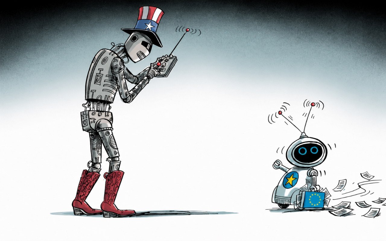 《经济学人》那张配图很传神:一个戴着美国国旗帽子的高大机器人,像主人一样遥控着一个矮小的欧洲机器人。欧洲机器人手里提着欧盟的小箱子,身边散落着文件,像是在无休止地处理合规、审批、隐私、认证和报告。漫画当然是夸张的,但它真正想表达的不是“欧洲不会创新”,而是一个更残酷的问题:当规则越来越复杂,真正付得起合规成本的,往往不是创业公司,而是巨头。