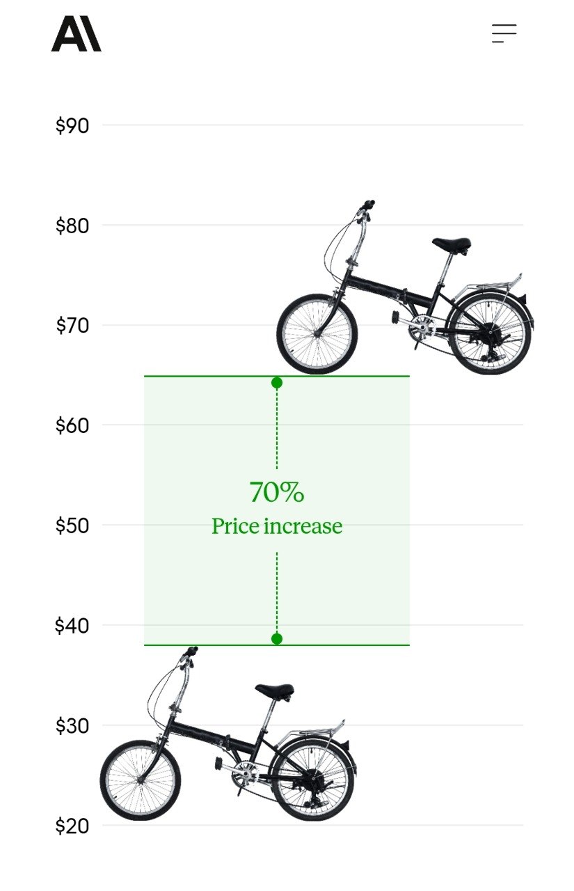 Anthropic 在博客中还举了一个很典型的例子:一辆需要修理的二手折叠自行车,在相同卖家、相同买家、相同商品设定下,Haiku 最终谈成的价格是 38 美元,而 Opus 却能把它谈到 65 美元,涨幅接近 70%。